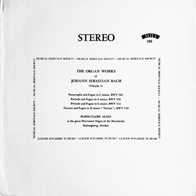 J.S.バッハ:前奏曲とフーガ イ長調 BWV.536(J.S.Bach:Prelude and Fugue in A major, BWV 536)(Organ)マリー=クレール・アラン:1961年12月10日~12日録音(Marie-Claire Alain:Recorded December 5-8, 1961)